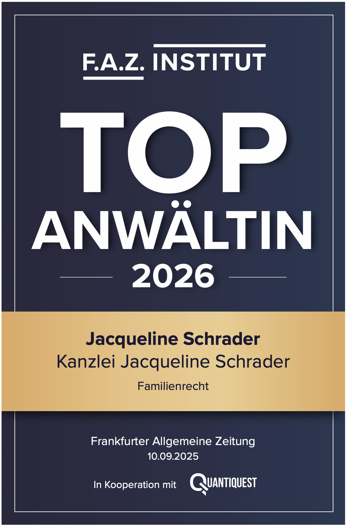 Im Jahr 2025 wurde ich für exzellente anwaltliche Leistungen ausgezeichnet durch die „Frankfurter Allgemeine Zeitung“ zur TOP ANWÄLTIN 2026 im Familienrecht.